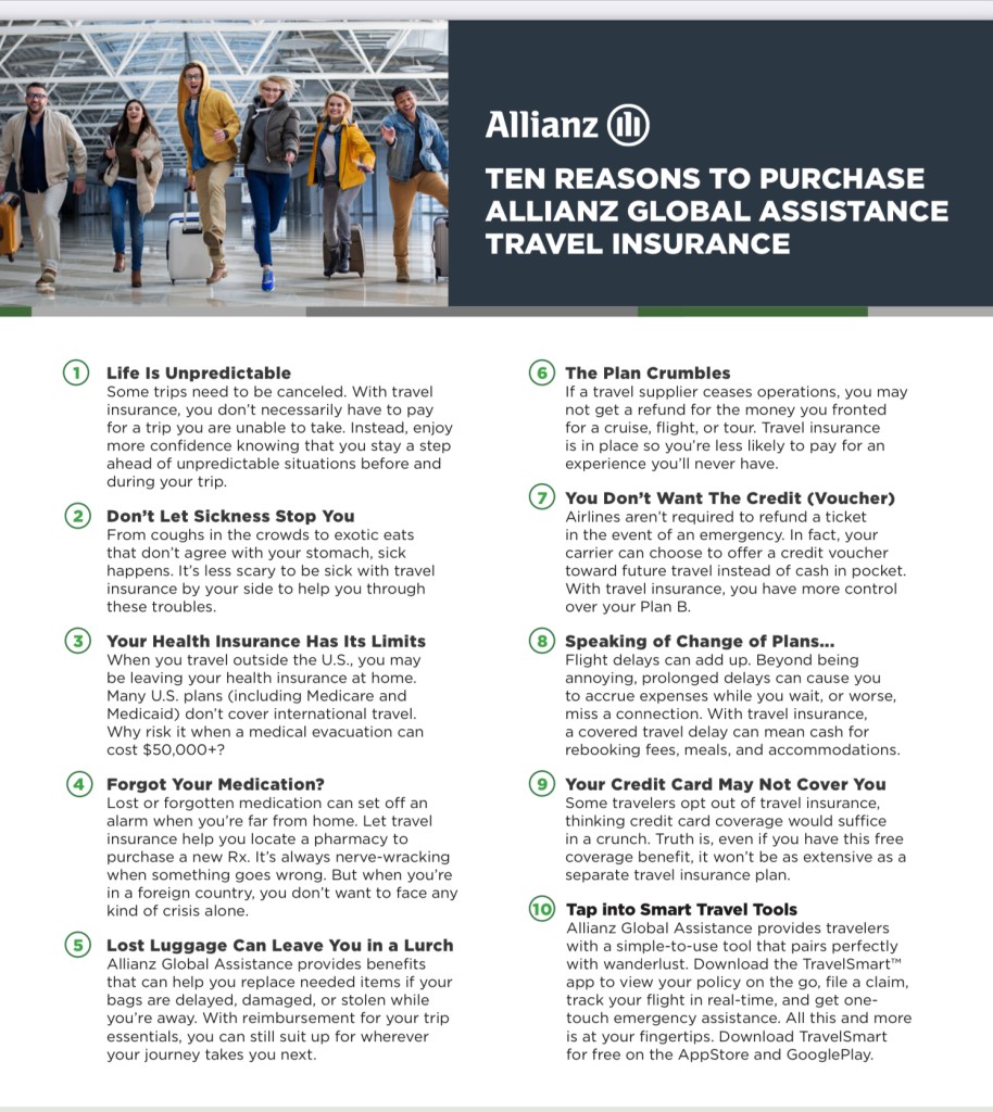 My company offers policies from Allianz Insurance, which has a good reputation in the industry. I give my clients quotes but encourage them to check around before they purchase their policy from me. Just google “travel insurance” and read through the different available options. Again, you need to research the coverage options before you buy.