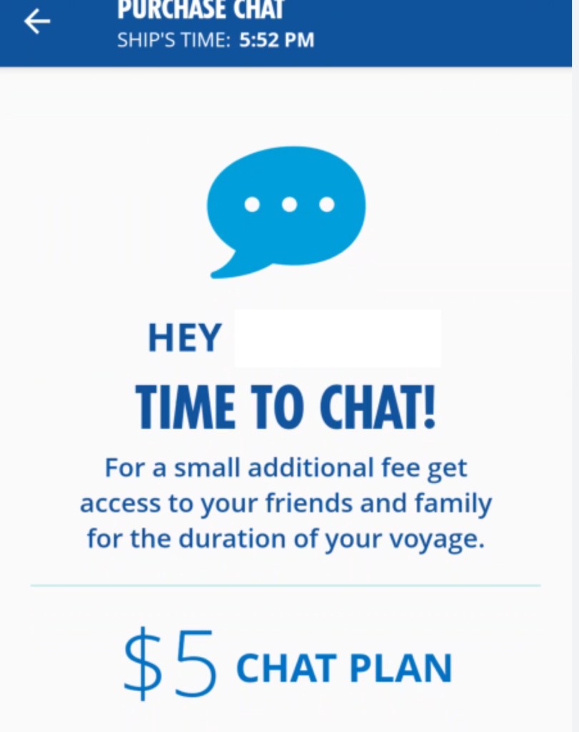 - Onboard Chat (fee applies): For a small fee, you can chat with other guests who have also activated the feature.