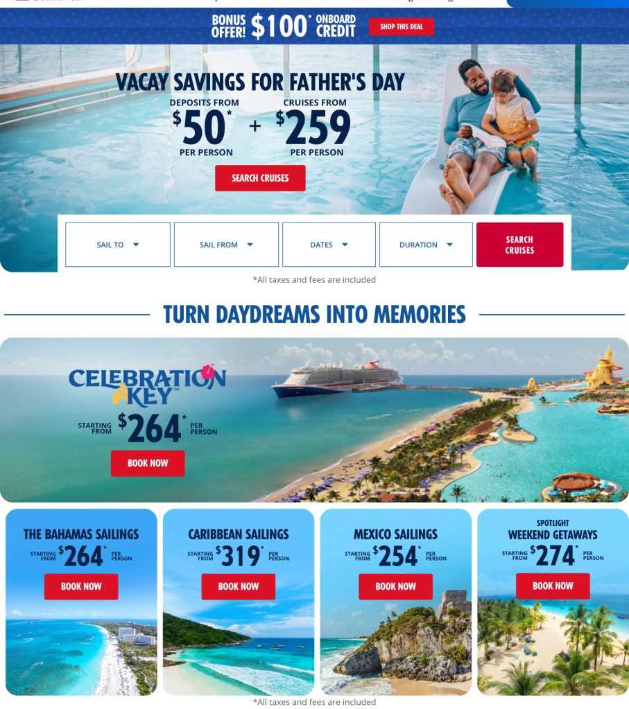- Lowest price guarantee (if Carnival drops the fare, you can get onboard credit or rate adjusted).