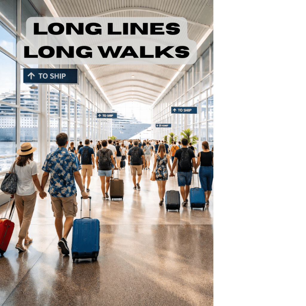 Boarding your ship will involve hurrying, walking, waiting in lines and walking some more!
